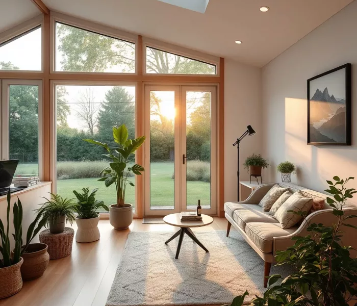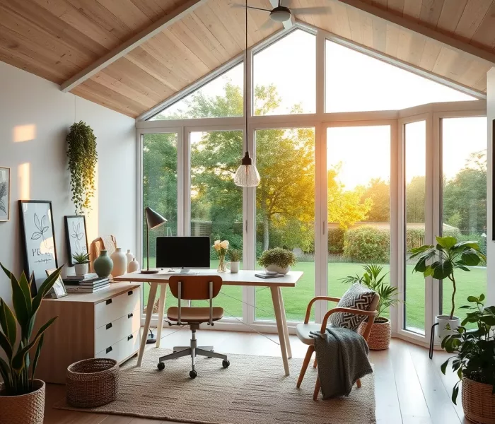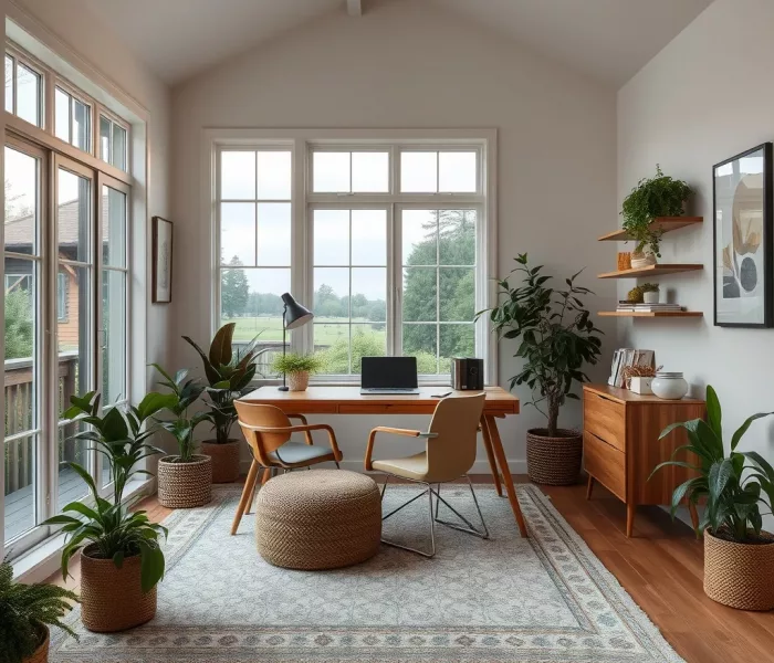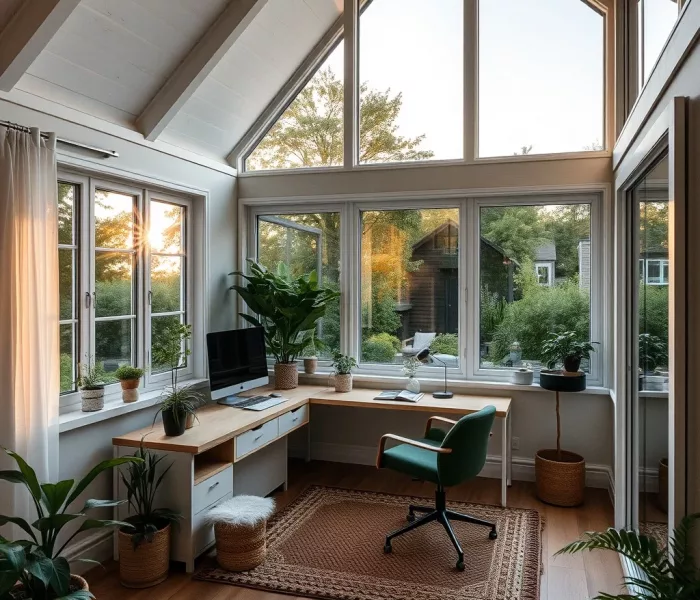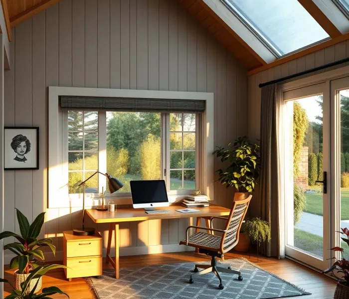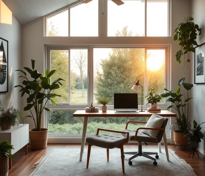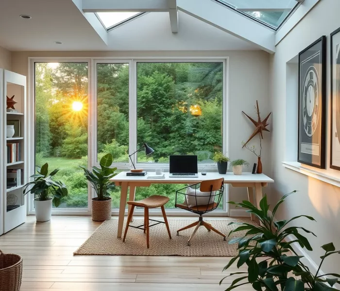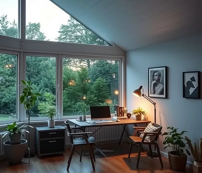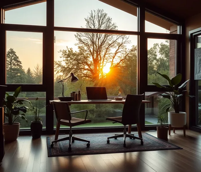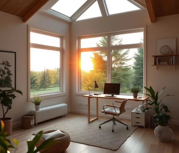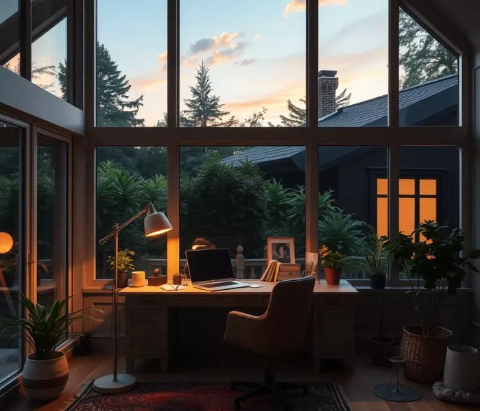 Das Büro in einem modernen Haus verkörpert die Vereinigung von minimalistischem Design und funktionaler Eleganz. Große Fensterflächen durchfluten den Raum mit natürlichem Licht und bieten Ausblicke auf die urbane Umgebung oder Landschaften.